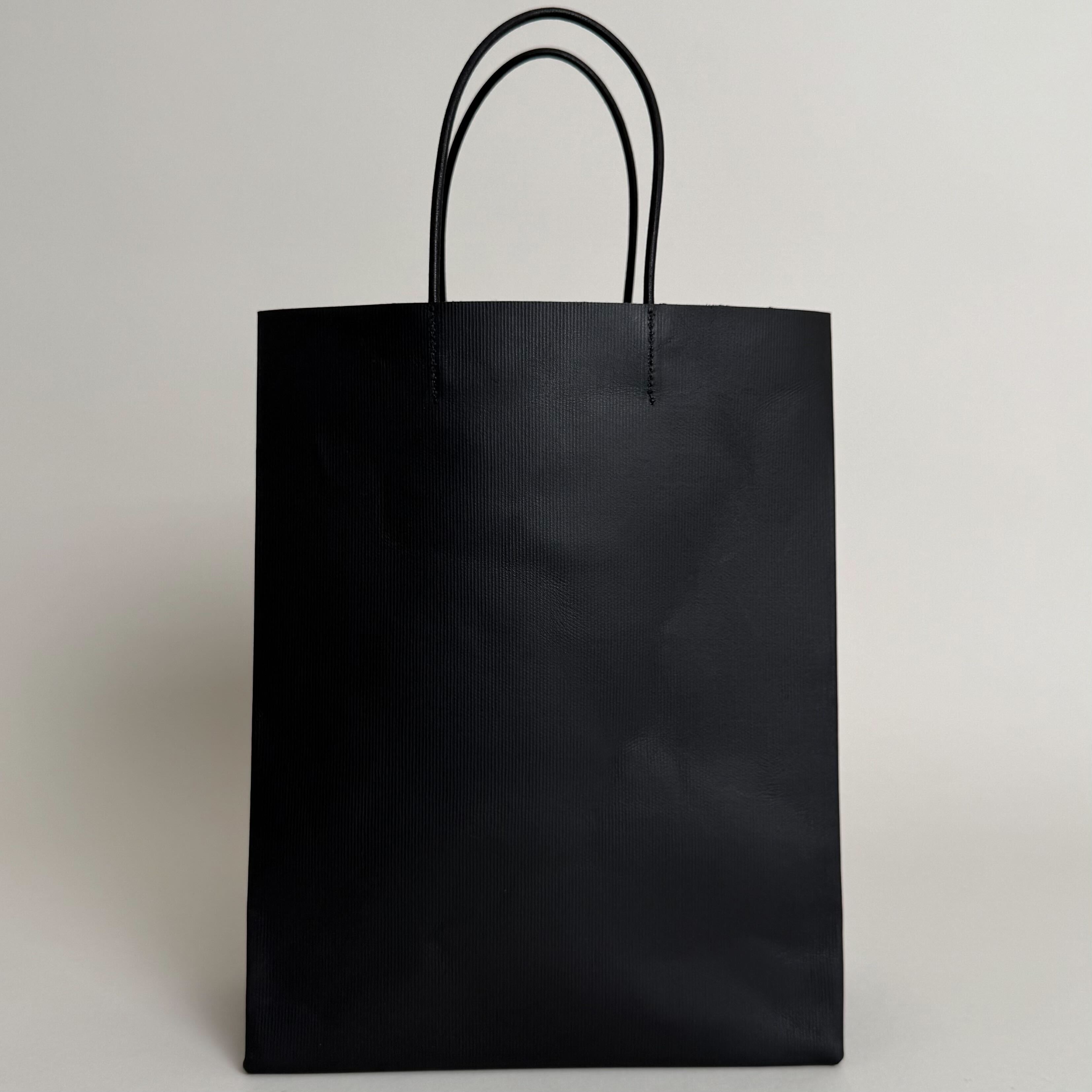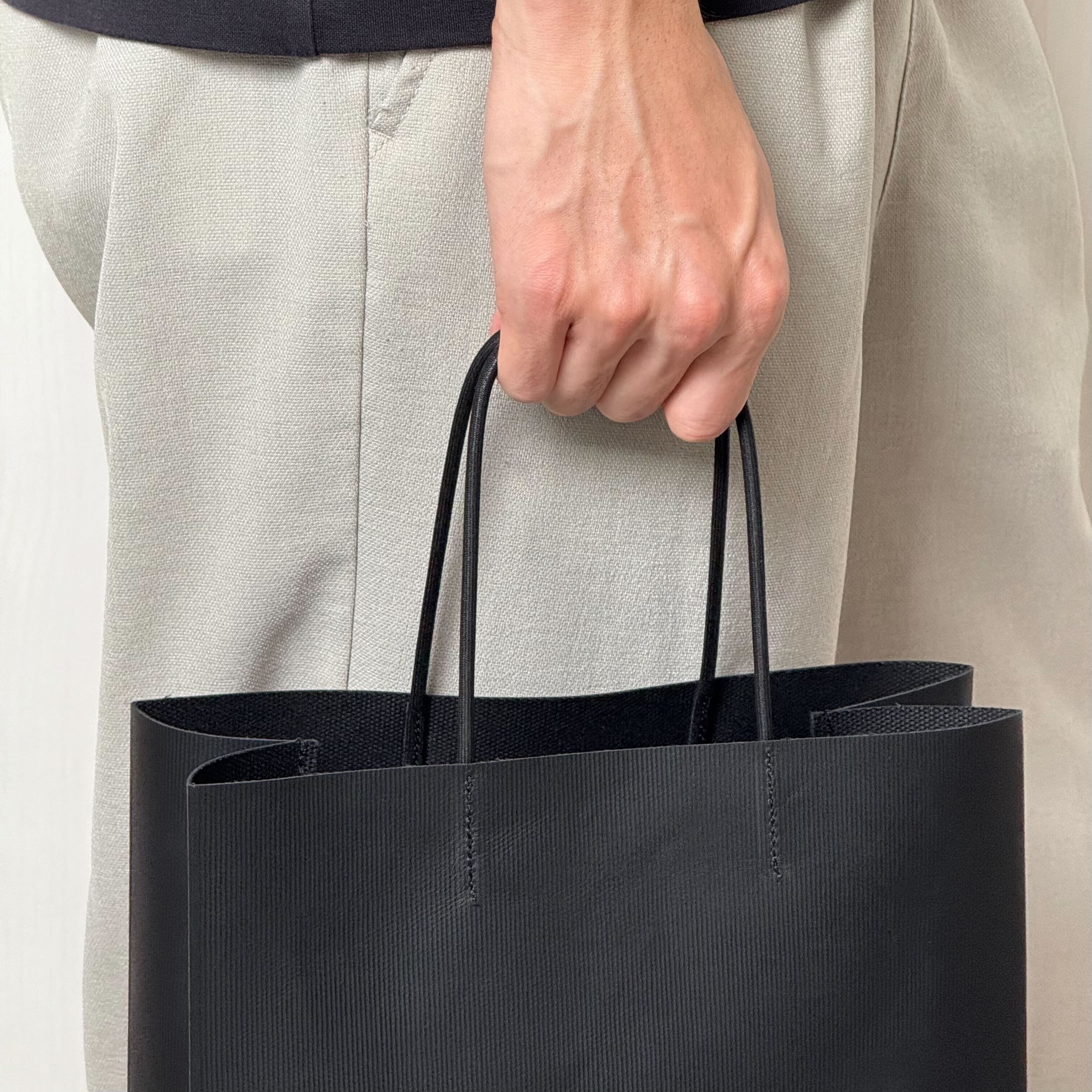 高級感あふれるマットブラックの紙袋レザーは、どんなシーンにも馴染む万能アイテム。